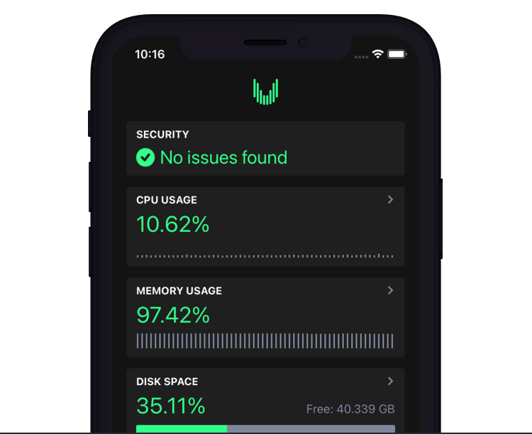 Unveil detects real-world iOS security threats with unprecedented methods and provides a customizable dashboard showing 100+ system details including device, system, CPU, memory, disk, network, Wi-Fi, cellular connection, and personal hotspot usage and specifications.
